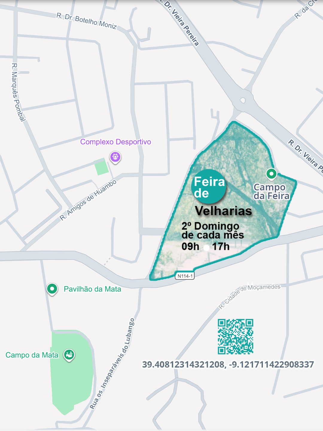 Nesse sentido, a Feira de Velharias realizar-se-á temporariamente no recinto da Feira Semanal (Campo da Feira), em Caldas da Rainha, situado na convergência da Rua Inseparáveis do Lubango com a Rua Dr. Vieira Pereira.